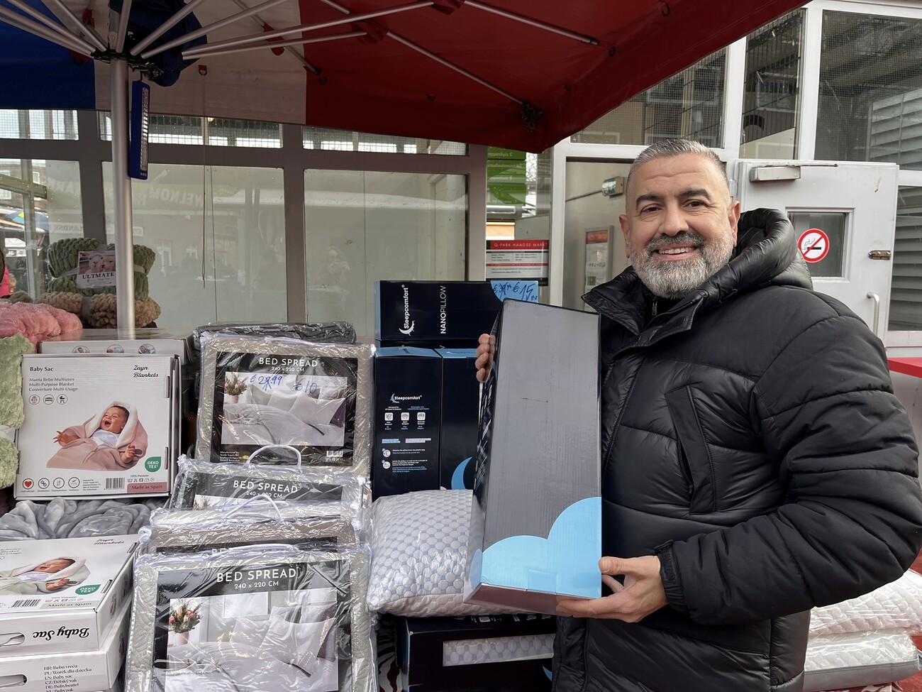 ‘Als standwerker heb ik geen vaste plaats op de markt. Ik verkoop mooi beddengoed hier, vandaag op een hoek op de markt. Door de nieuwe regels heb ik meer kans op een plek, want er komt een stop op nieuwe inschrijvingen. Dat is mooi, want er is weinig plaats voor standwerkers. En ik ben hier altijd, ik ben geen mooi-weer-standwerker. Iedereen die hier altijd staat wordt serieus genomen.’