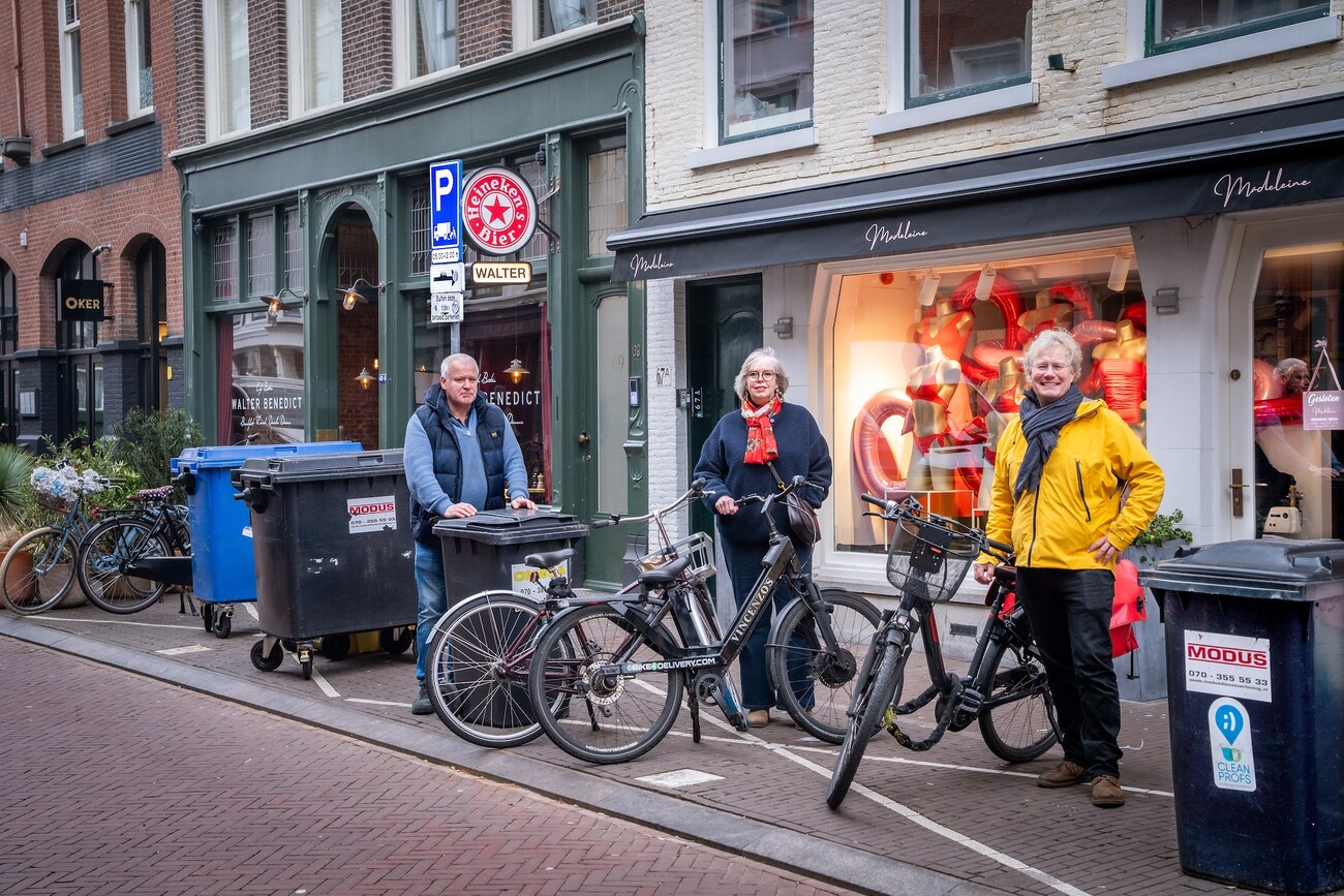 Op de foto van links naar rechts: Voorzitter Rob Bouwer van de winkeliersvereniging van de Denneweg, bestuurslid Agnès Philipse van de bewonersvereniging en programmamanager Laurens Tuinhout van de gemeente Den Haag. (foto: Arenda Oomen)