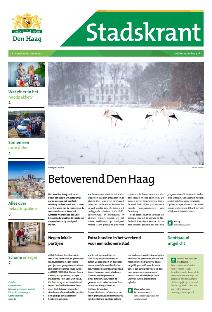 En ook in deze Stadskrant: Femke heeft haar noodpakket voor gezin en huisdieren klaar en geeft slimme tips. En winter in Den Haag betekent hard werken voor de strooiploegen, maar ook mooie sneeuwplaatjes. De krant van 28 januari wordt bezorgd als bijlage in uw huis-aan-huisblad.