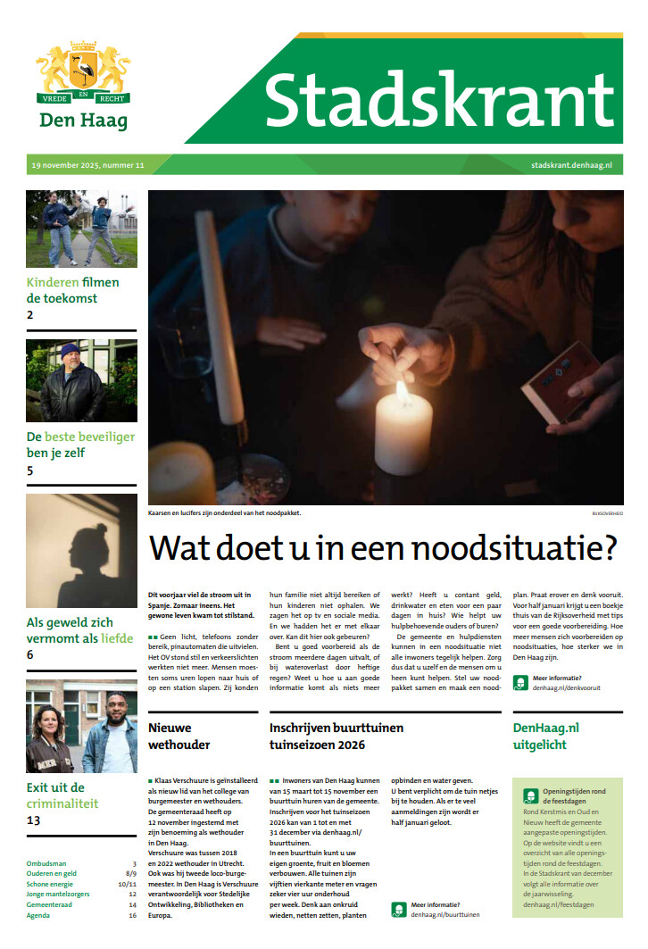 En ook in deze Stadskrant: Kinderen maakten een film over de toekomst van Den Haag. En oud-inbreker geeft preventietips: De beste beveiliger ben je zelf. De krant van 19 november wordt bezorgd als bijlage in uw huis-aan-huisblad.