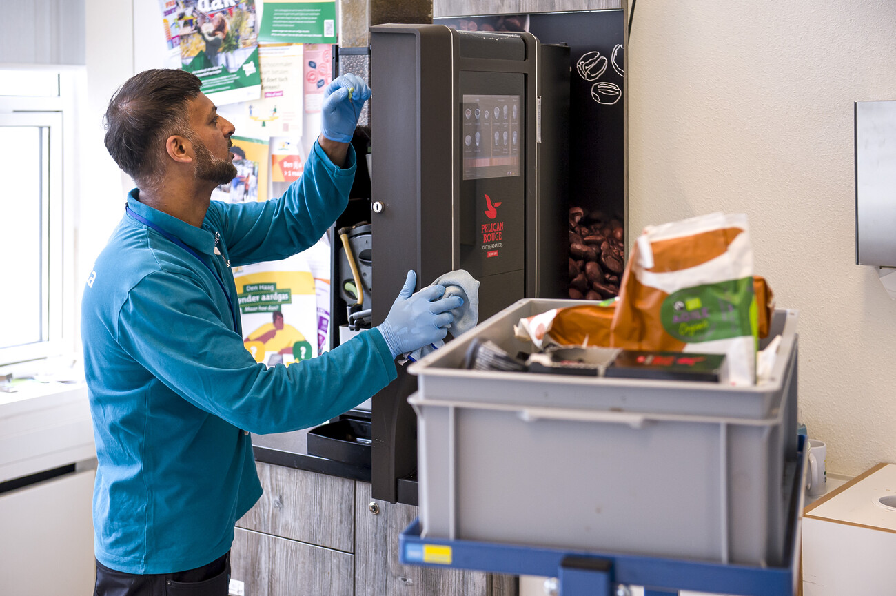 Shailendra aan het werk bij een koffieautomaat van Selecta op het Haagse stadhuis.