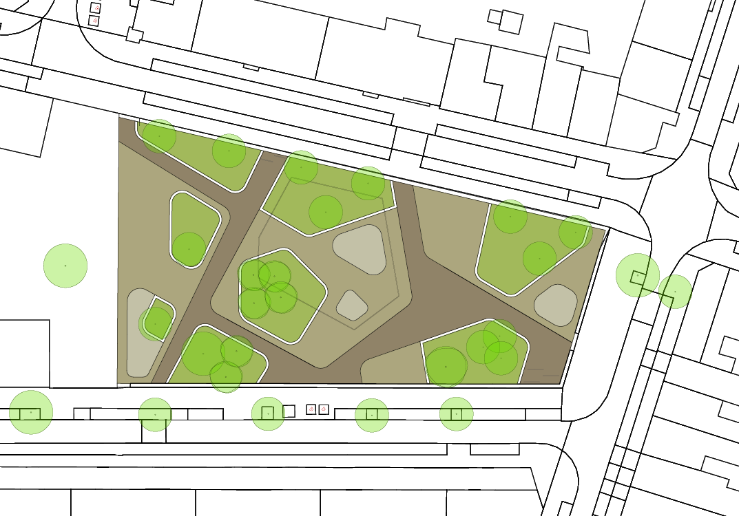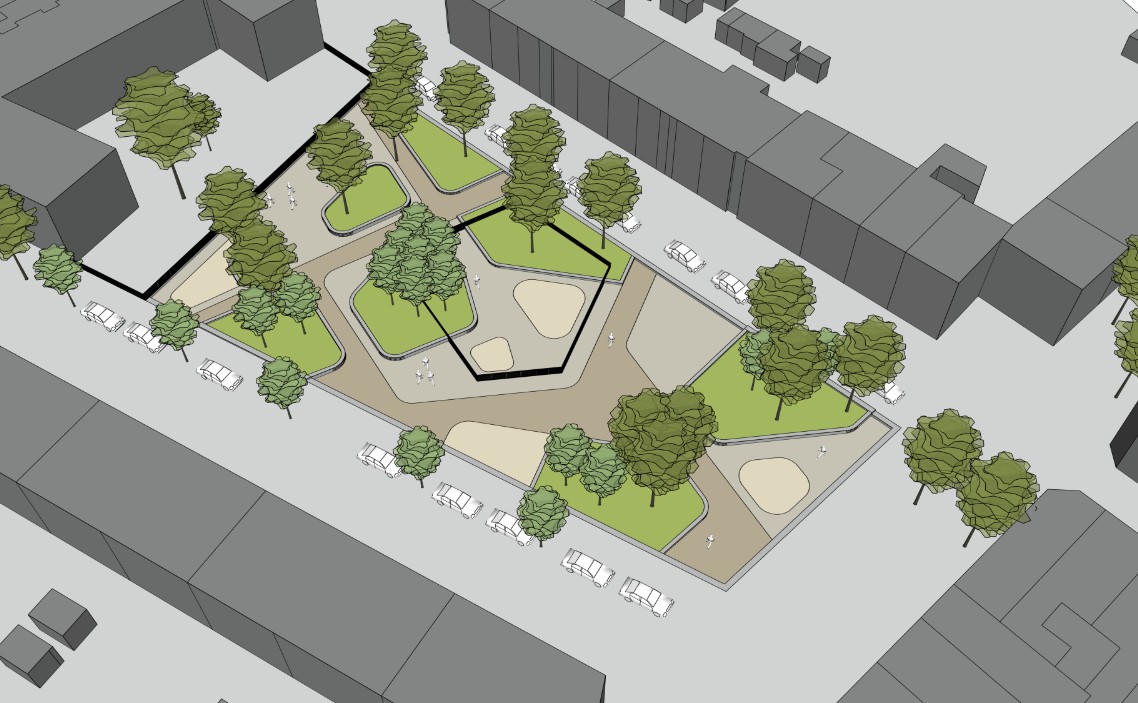 Op deze tekening ziet u het plein van bovenaf. Er is veel groen, met bomen en plantvakken verspreid over het plein. In het midden ligt een omheinde speelplek voor jonge kinderen. De plantvakken zijn verhoogd en hebben brede randen. Deze randen zijn bedoeld om op te zitten. Het plein kan regenwater goed opvangen.