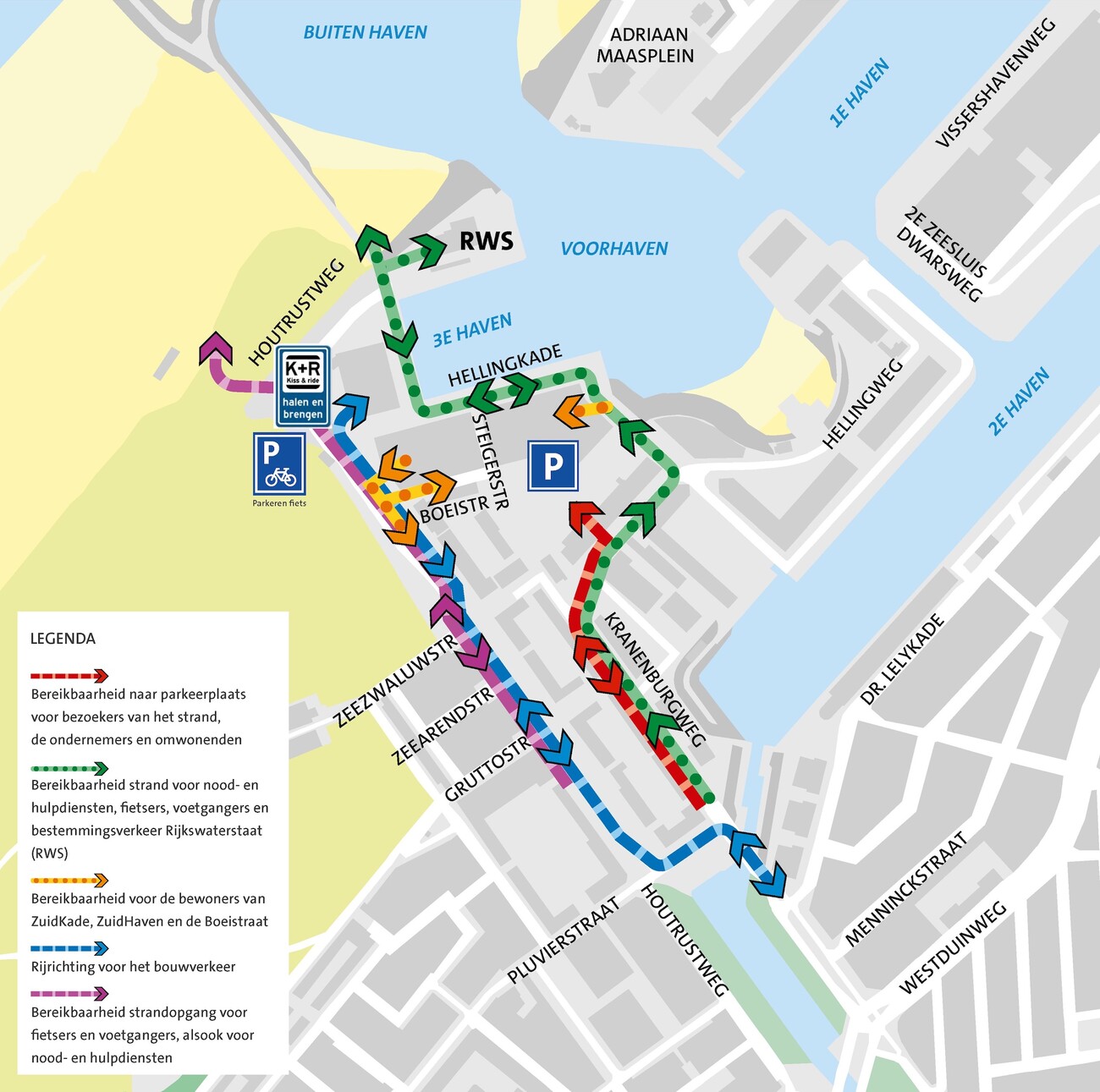 De bestaande omleidingsroutes blijven. Voor fietsers, voetgangers, nood- en hulpdiensten is langs de Houtrustweg een vrij liggend pad aangelegd tot aan strandslag 12. Hier is de fietsenstalling teruggeplaatst. De fietsenstalling op het strand wordt in oktober 2025 verwijderd. De Houtrustweg is vanaf 20 oktober 2025 open voor alle verkeer, inclusief bouwverkeer.