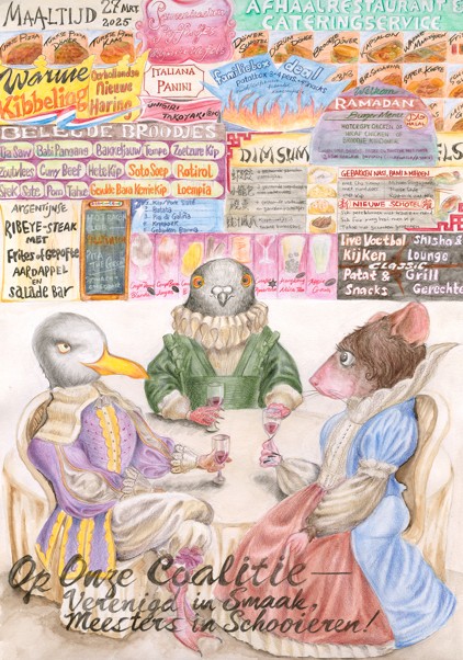 Van 2023 tot 2025 was illustrator en beeldend kunstenaar Babette Wagenvoort de eerste Haagse Stadstekenaar. Zij bracht Den Haag in beeld door bekende en onbekende Haagse plekken te bezoeken waar mensen samenkomen. In haar tekeningen legde zij de ervaringen en belevingen vast van Haagse inwoners. Babette Wagenvoort woont en werkt in Den Haag. Hieronder ziet u een van haar tekeningen.