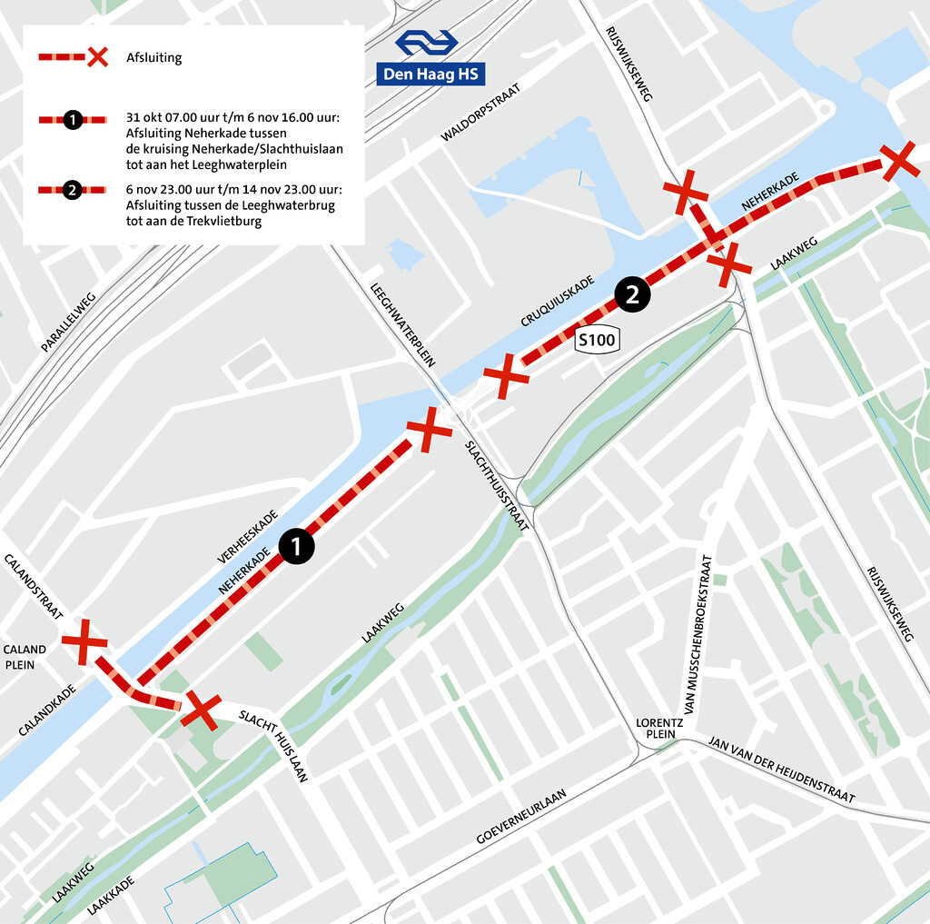Van vrijdag 31 oktober 07.00 uur tot donderdag 6 november 16.00 uur wordt gewerkt aan het deel tussen de Slachthuislaan en Leeghwaterplein. Van donderdag 6 november 23.00 uur tot vrijdag 14 november 23.00 uur aan het stuk tussen de Leeghwaterbrug en Trekvlietbrug.