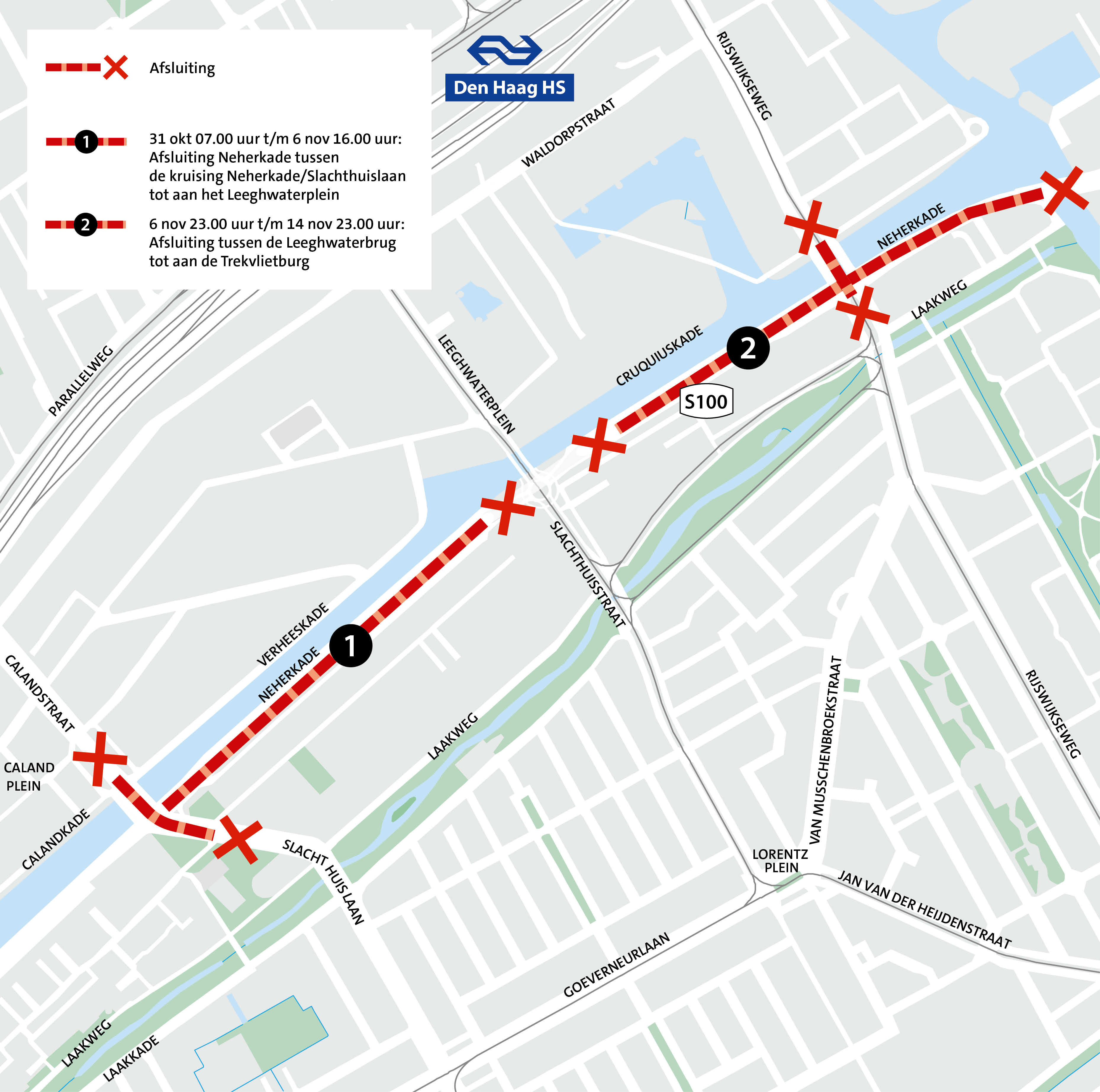 Van vrijdag 31 oktober 07.00 uur tot donderdag 6 november 16.00 uur wordt gewerkt aan het deel tussen de Slachthuislaan en Leeghwaterplein. Van donderdag 6 november 23.00 uur tot vrijdag 14 november 23.00 uur aan het stuk tussen de Leeghwaterbrug en Trekvlietbrug.