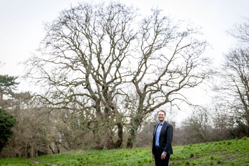 Op de foto wethouder Robert Barker (Buitenruimte, Dierenwelzijn, Milieu) bij de Veteraanboom Belvedère eik aan de Duinweg. Foto: Valerie Kuypers