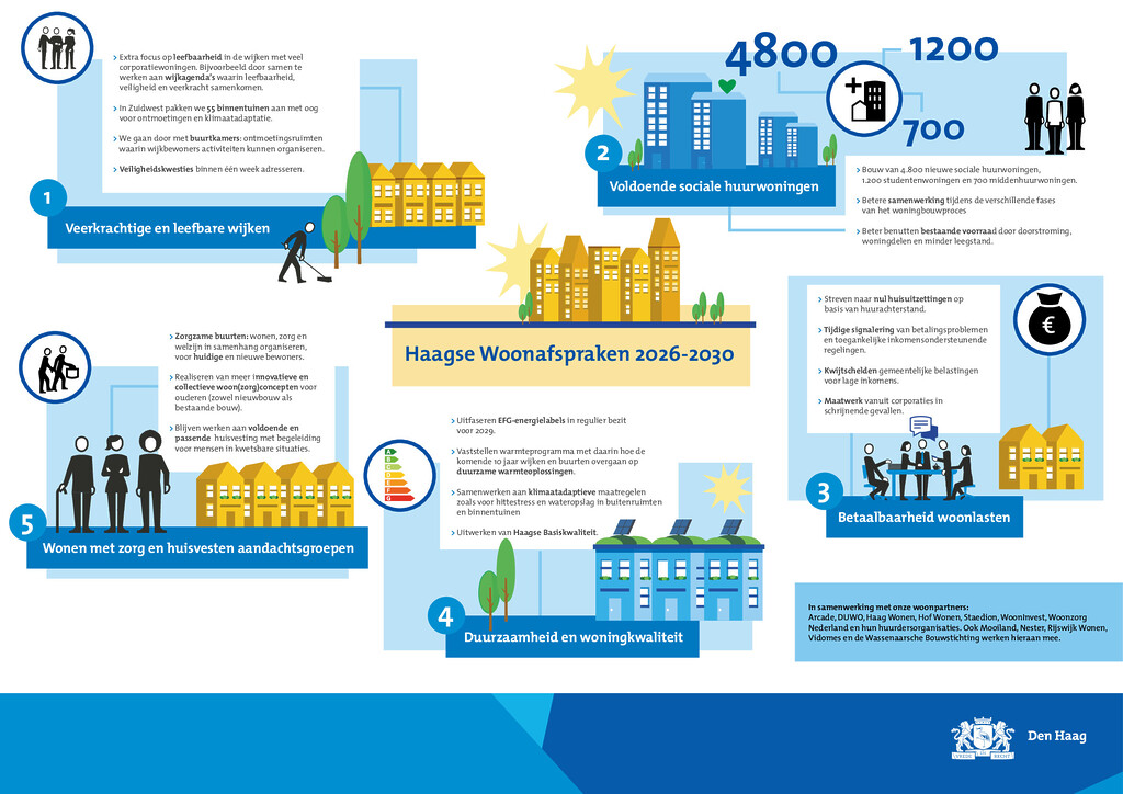 Daarnaast ligt de focus op de betaalbaarheid van wonen. De betrokken partijen vinden dat Den Haag een toegankelijke stad moet blijven voor mensen in verschillende levensfases en met uiteenlopende inkomens en achtergronden. Door te zorgen voor meer betaalbare woningen en door het verlagen van de energiekosten via verduurzaming, kunnen de woonlasten worden beperkt.
